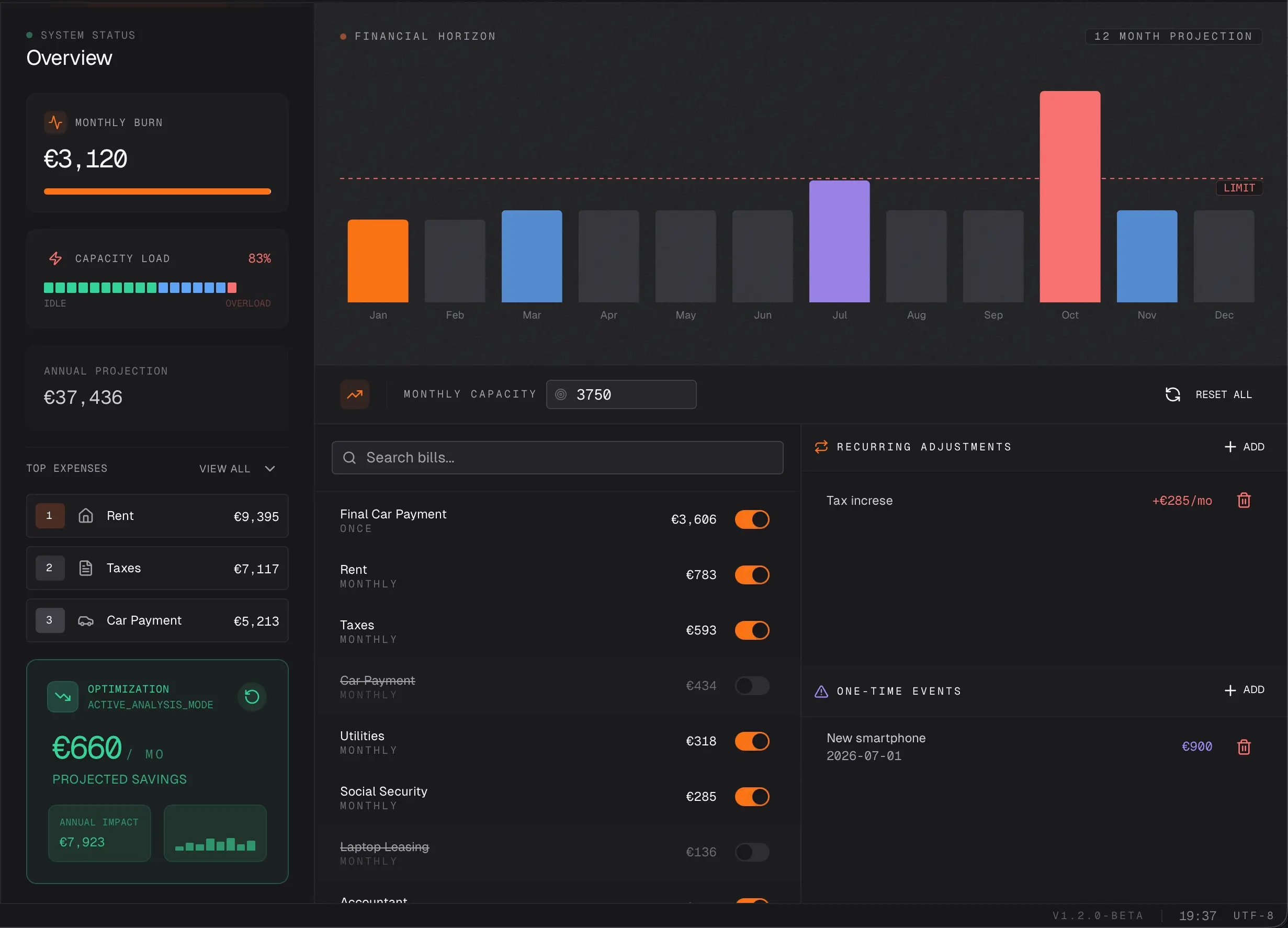 12-month forecast. Know about expensive months before they hit. Simulate changes before committing.
